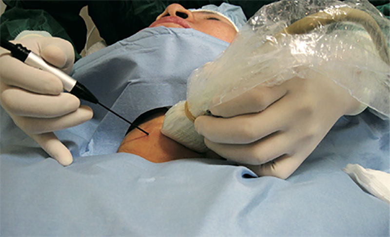 «Радиочастотная абляция (РЧА) злокачественных узлов щитовидной железы является относительно недавним вариантом для пациентов, которые не подходят для операции или отказываются от нее. Наиболее типичным показанием являются узлы <1 см в наибольшем размере, хотя узлы щитовидной железы до 2 см поддаются лечению. Кроме того, положение узла имеет первостепенное значение, поскольку для абляции таких поражений требуется запас прочности, который гарантировал бы полное уничтожение всех злокачественных клеток. Таким образом, даже небольшие узелки, прилегающие к критическим областям, не должны подвергаться РЧА. Узлы, расположенные рядом с возвратным гортанным нервом на задней стороне щитовидной железы, не подходят для РЧА. Для РЧА нужно тщательно отобрать узлы, поддающиеся рассечению посредством гидродиссекции, рядом с трахеей или сонными артериями» [1].