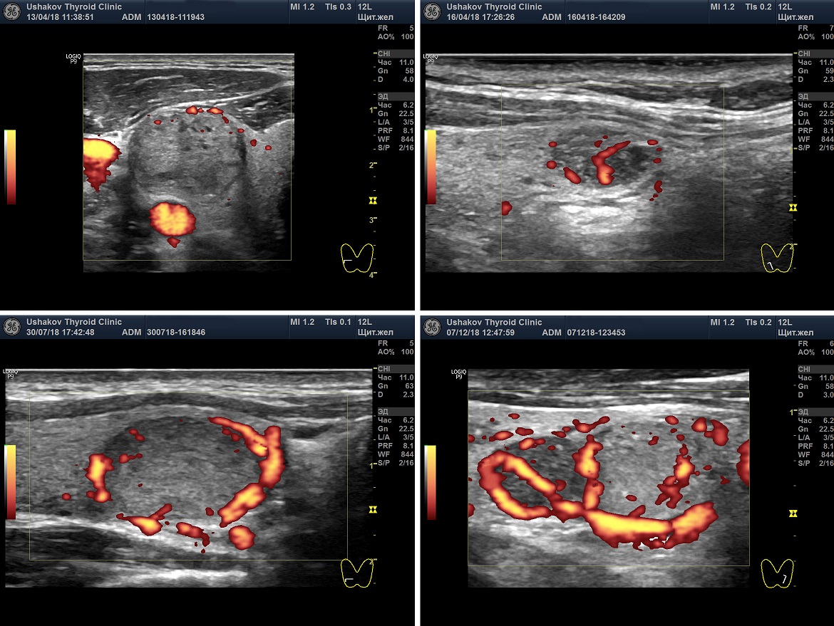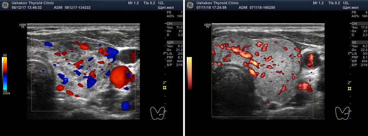При каждом УЗИ щитовидной железы показана и обязательна Допплерография.