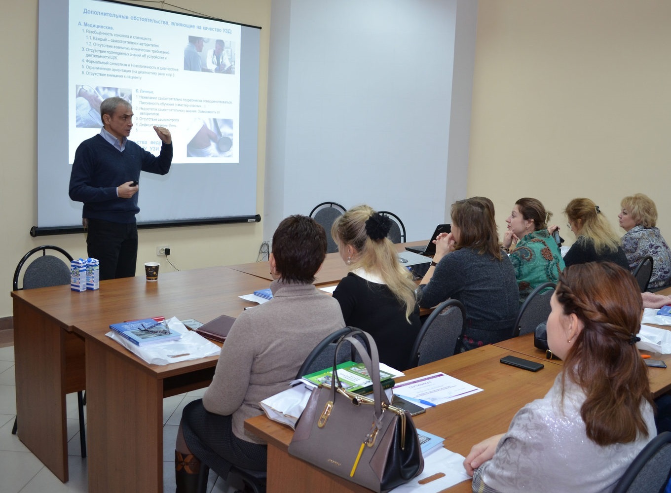 Рисунок 8. Главный врач Клиники щитовидной железы, к.м.н. А.В. Ушаков проводит обучение специалистов УЗИ.