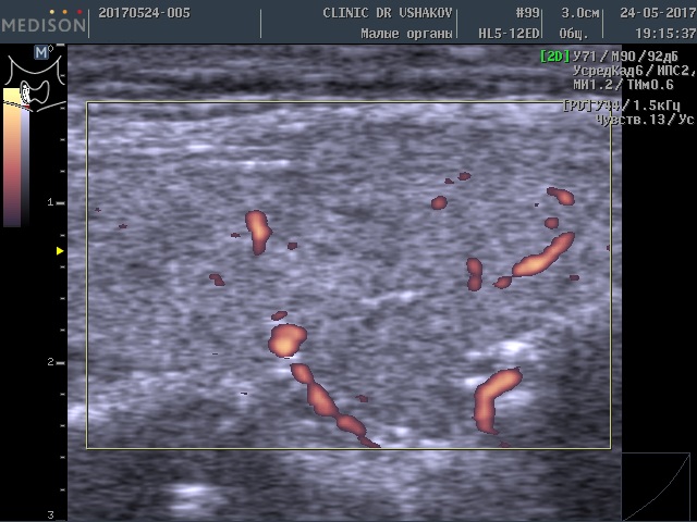 умеренное усиление кровотока (рис. 1 и 2). Это заметно на снимках, где в специальном режиме для оценки сосудов (ЭДК) определяется увеличенное количество красных элементов (преимущественно увеличенного размера). Такая картина УЗИ не редко встречается при малом или умеренном гипертиреозе (с тиреотоксикозом), который врачи называют «повышением функции щитовидной железы».