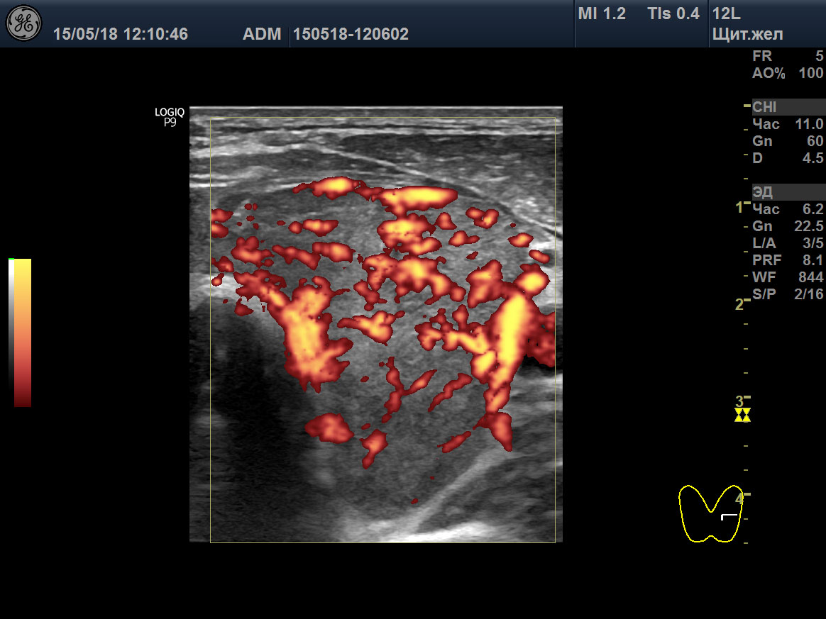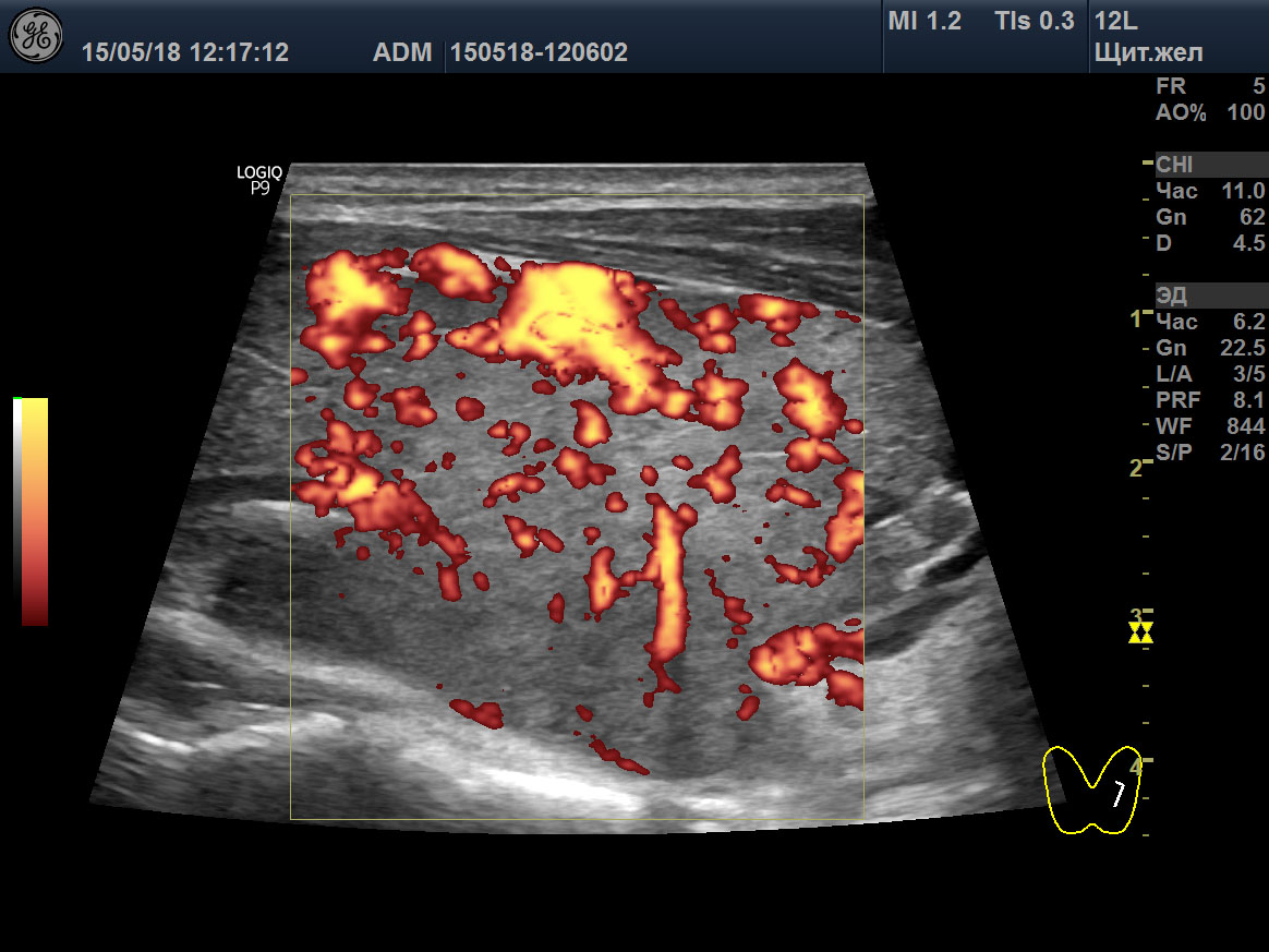 15 мая 2018 ультразвуковое исследование (УЗИ) щитовидной железы выявило зоб 3 степени (объём 45 мл; 23,6D + 21,4S), признаки умеренного отёка стромы (гомогенная гипоэхогенность паренхимы), значительное усиление интенсивности кровотока, систолическую пиковую скорость (SPV) кровотока в системе верхних щитовидных артериях (STA) 123 cm/sec справа и 160 cm/sec слева (рисунок: A, B, C).