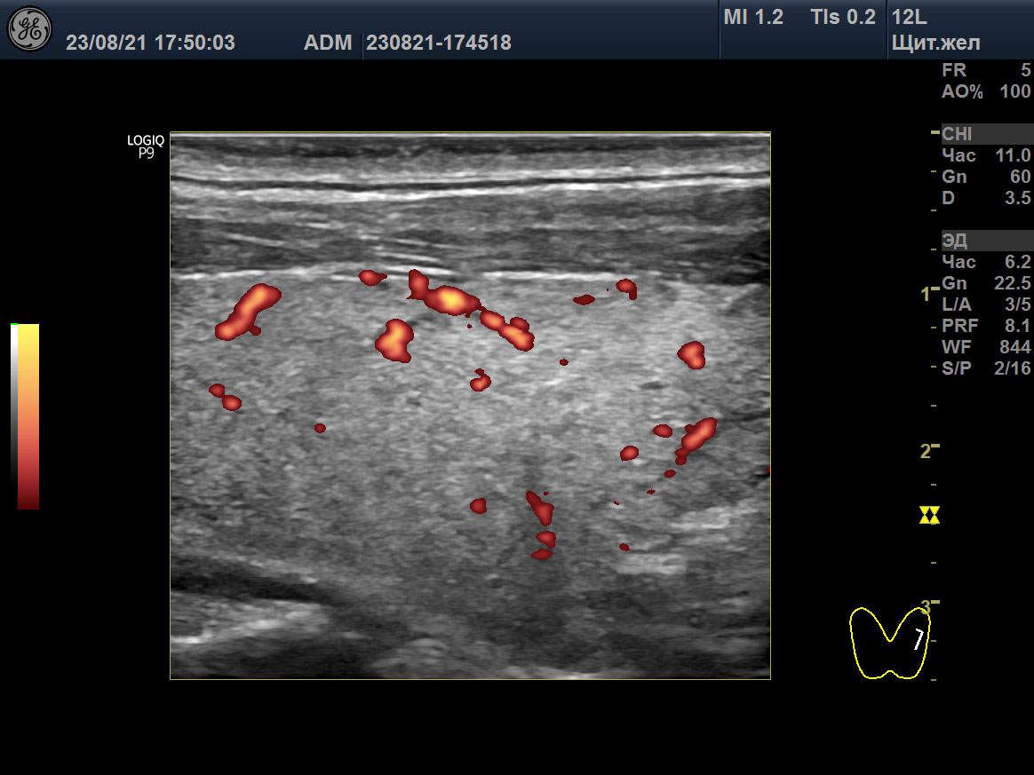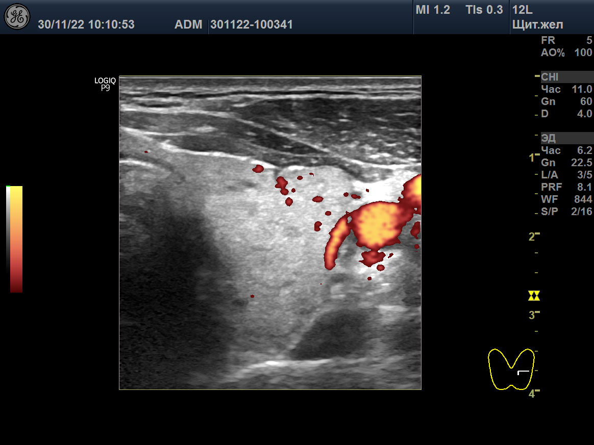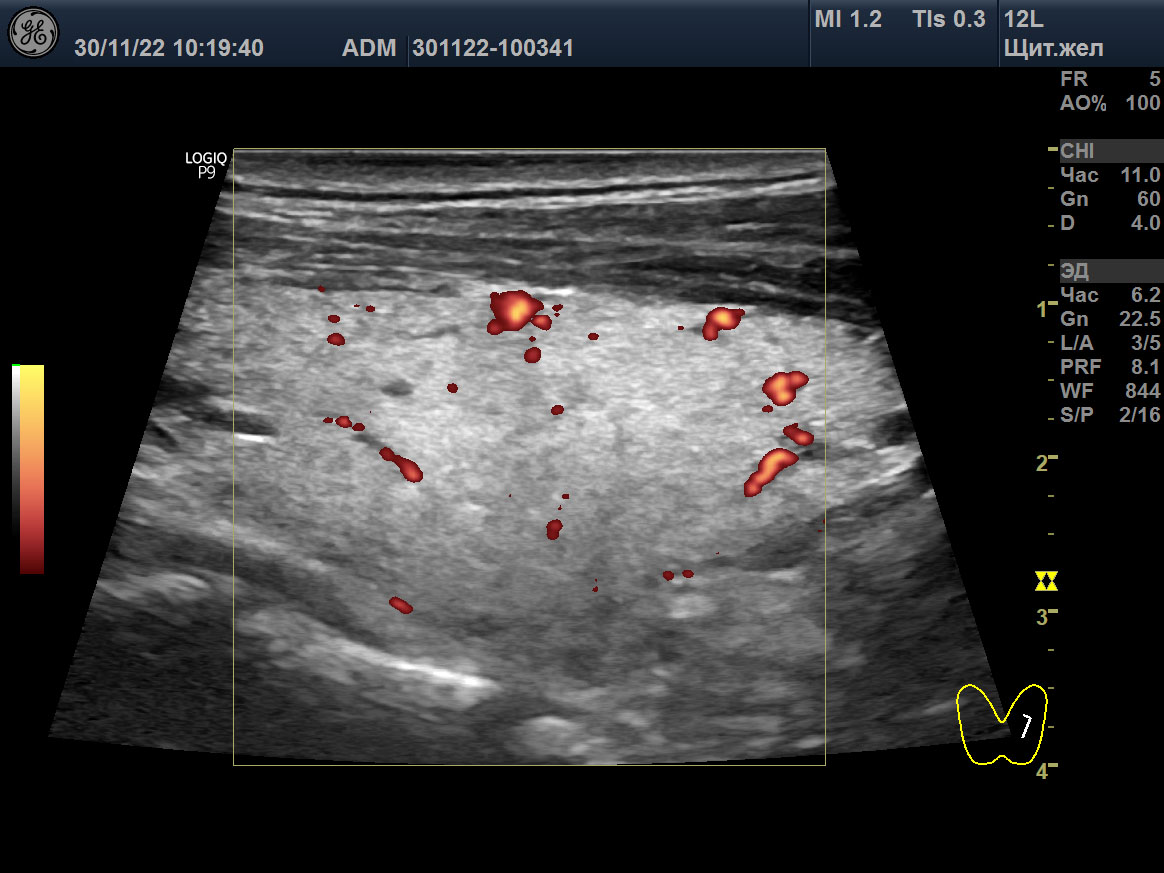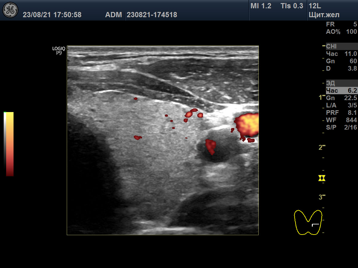 Вместе с тем, в августе 2021, при нормальном гормональном обмене и АТ-рТТГ 0,3 Ед/л (<1,5), объём щитовидной железы остался прежним (30,4 мл), у дорсального края в обеих долях сохранялись некоторые признаки отёка стромы, интенсивность кровотока с двух сторон в очень малой мере была усилена, улучшилась SPV STA – 27 cm/sec справа и 39 cm/sec слева (таблица 2; рисунок: D, E, F). В декабре 2022 ультразвук показал подобные признаки с незначительным улучшением: объем щитовидной 24 мл и преобладание изоэхогенной паренхимы.