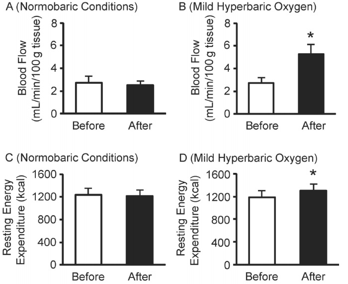 Рис. 6. Кровоток (A и B) и расход энергии (С и D) при нормобарической (A и C) и мягкой гипербарической оксигенации (B и D). Значения средства и стандартные отклонения, полученные из 14 участников; *р < 0,05