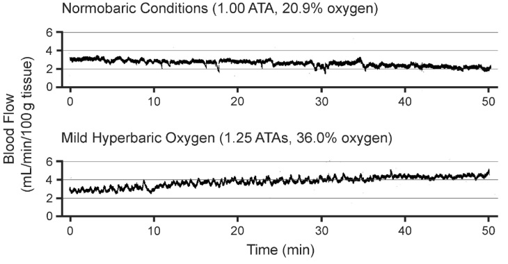 В этом же исследовании у испытуемых оценивалось изменение кровотока. При обычном дыхании и давлении изменений не наблюдалось, тогда как после мягкой гипербарической оксигенации кровоток фактически удвоился (с 2,7±0.5 мл/мин/100 г ткани до 5,3±0,8 мл/мин/100 г ткани) [9]. Было выявлено, что усиление кровотока начинается на 8-10 минуте, усиливается на 11-12 минуте и далее плавно увеличивается на всём протяжении процедуры (50 минут) (