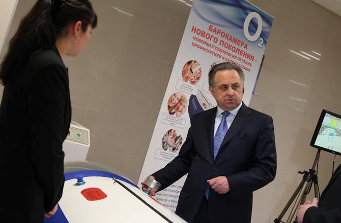 Рис. 4. Министр спорта РФ В.Л. Мутко изучает возможности нормоксической баротерапии.
