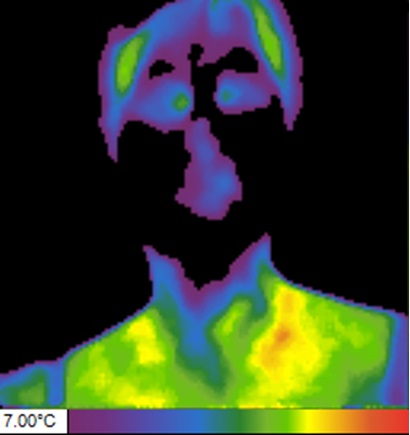 Рисунок 5. Снимок термографии сделан сразу после прихода пациентки в Клинику (г.Москва, ноябрь, температура воздуха на улице -8°С). Видно, что открытая часть лица не успела нагреться и имеет очень низкую температуру (выглядит чёрным).