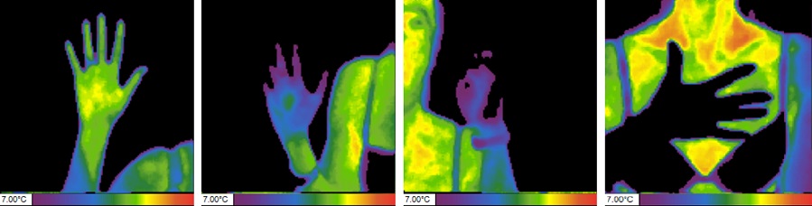 Рисунок 7. Термографические снимки рук у разных пациенток, адаптированных к температуре помещения. Сравните нормальный температурный процесс и три степени гипотермии конечностей (третья степень ― кисть не видна). По температуре кистей рук судят о компенсации и реактивности периферической нервной системы.