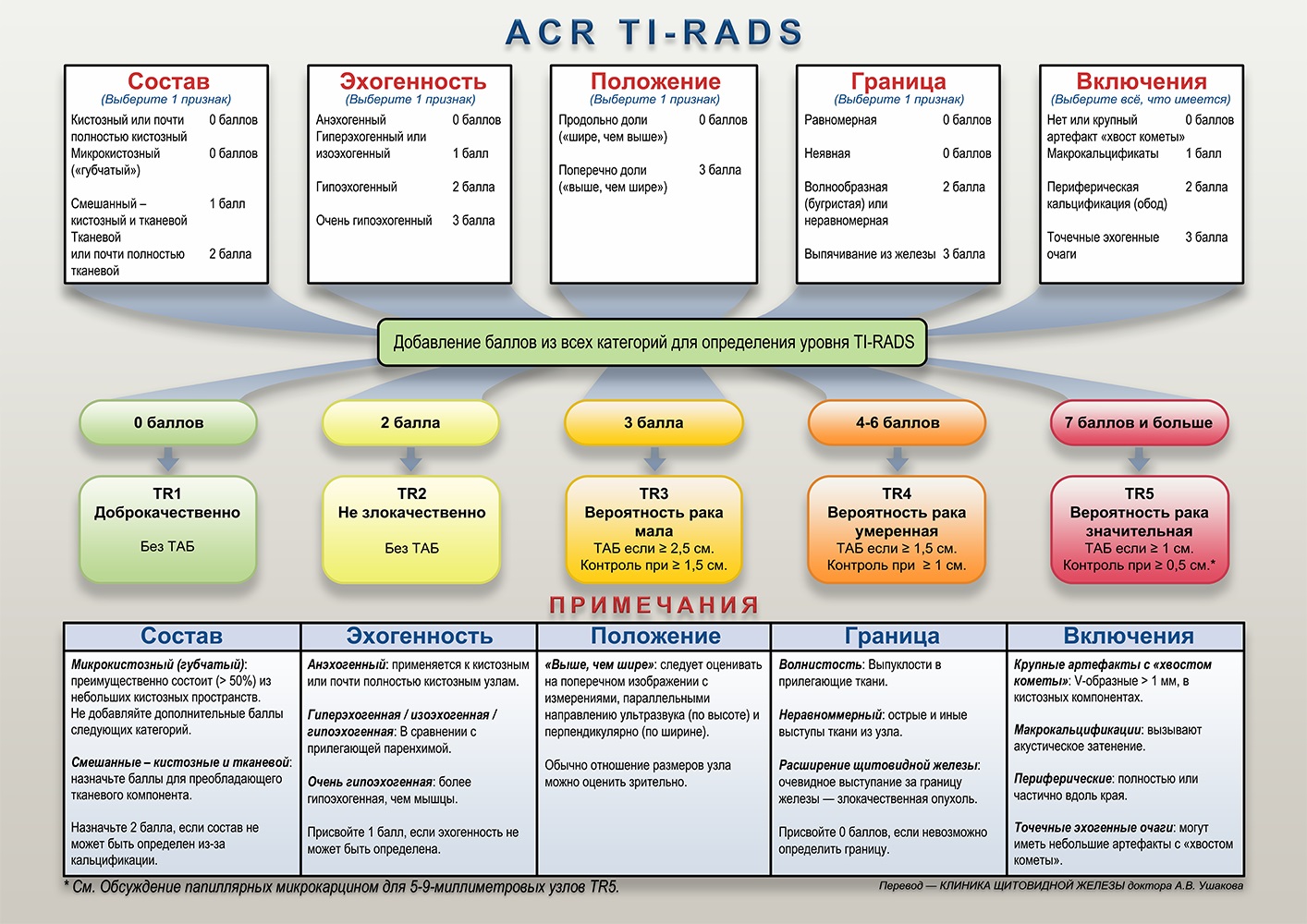 Рисунок 1 Схема ACR TI-RADS, перевод от Клиники щитовидной железы доктора А.В. Ушакова (по материаламTessler FN, Middleton WD, Grant EG, Hoang JK, Berland LL, Teefey SA, Cronan JJ, Beland MD, Desser TS, Frates MC, Hammers LW, Hamper UM, Langer JE, Reading CC, Scoutt LM, Stavros AT ACR Thyroid Imaging, Reporting and Data System (TI-RADS): White Paper of the ACR TI-RADS Committee. J Am Coll Radiol. 2017 May;14(5):587-595).