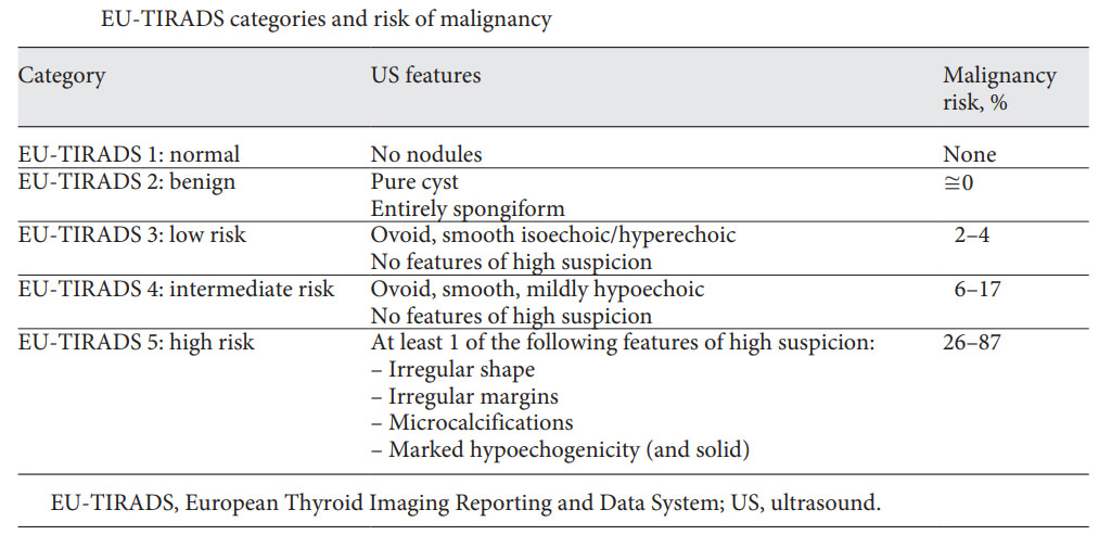 5 категория EU TI-RADS соответствует 4 или 5 уровню системы ACR TI-RADS, поскольку он включает 1 и более значительно выраженные ультразвуковые признаки рака узлов щитовидной железы. Пункционная биопсия в таком случае показана при размере узла от 10 мм и более