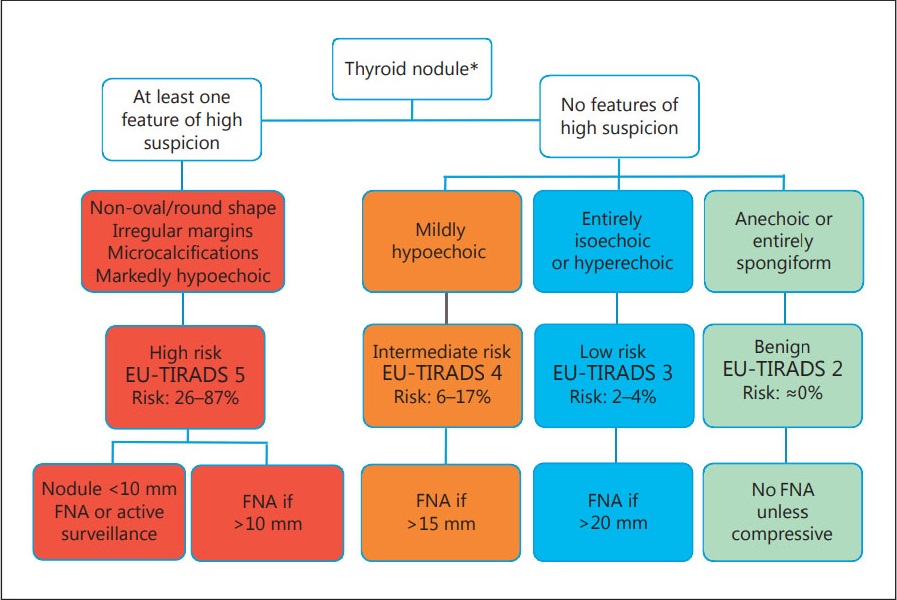 Рисунок 4 Алгоритм (блок-схема) EU TI-RADS (По материалам Eur Thyroid J. 2017 Sep;6(5):225-237. Russ G, Bonnema SJ, Erdogan MF, Durante C, Ngu R, Leenhardt L. European Thyroid Association Guidelines for Ultrasound Malignancy Risk Stratification of Thyroid Nodules in Adults: The EU-TIRADS).