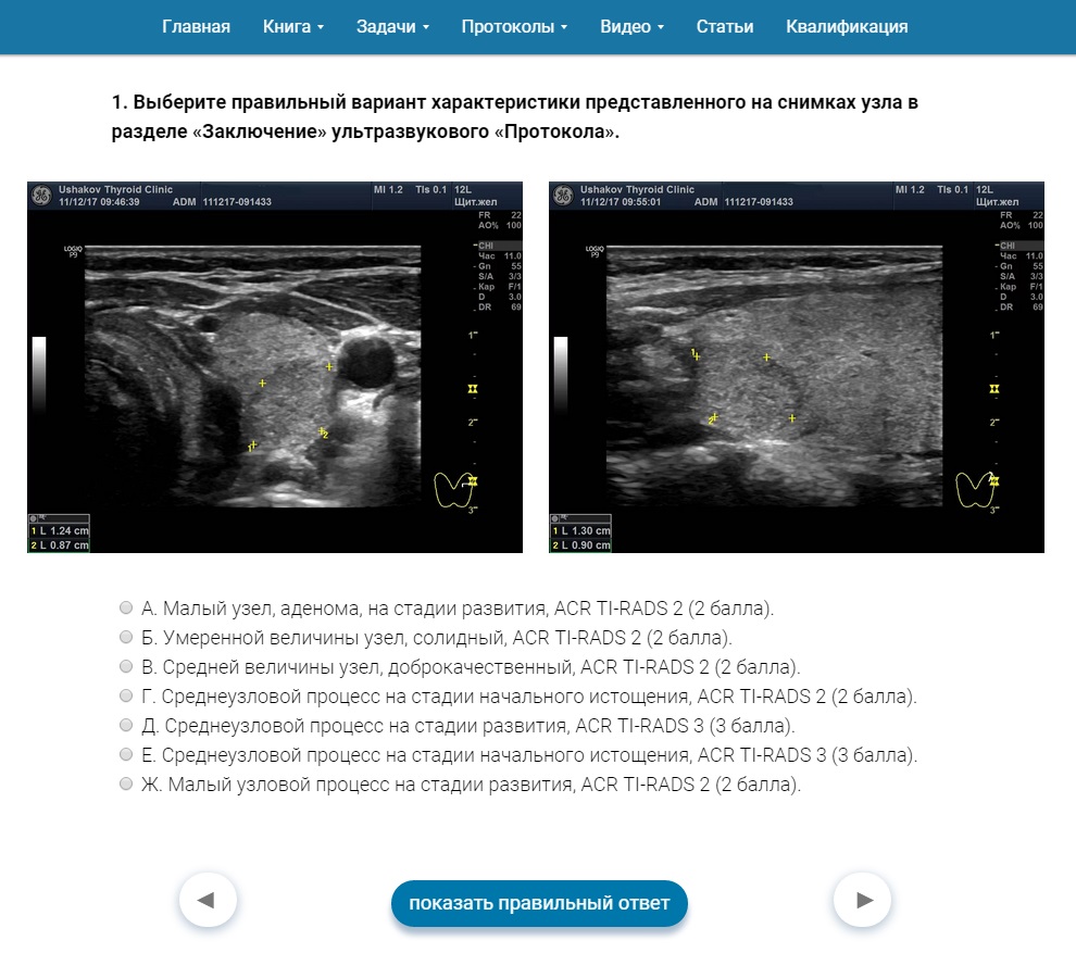 Рисунок 2 Более 80 теоретических и практических задач по ACR TI-RADS на сайте Научной школы УЗИ щитовидной железы от Клиники щитовидной железы доктора А.В. Ушакова.